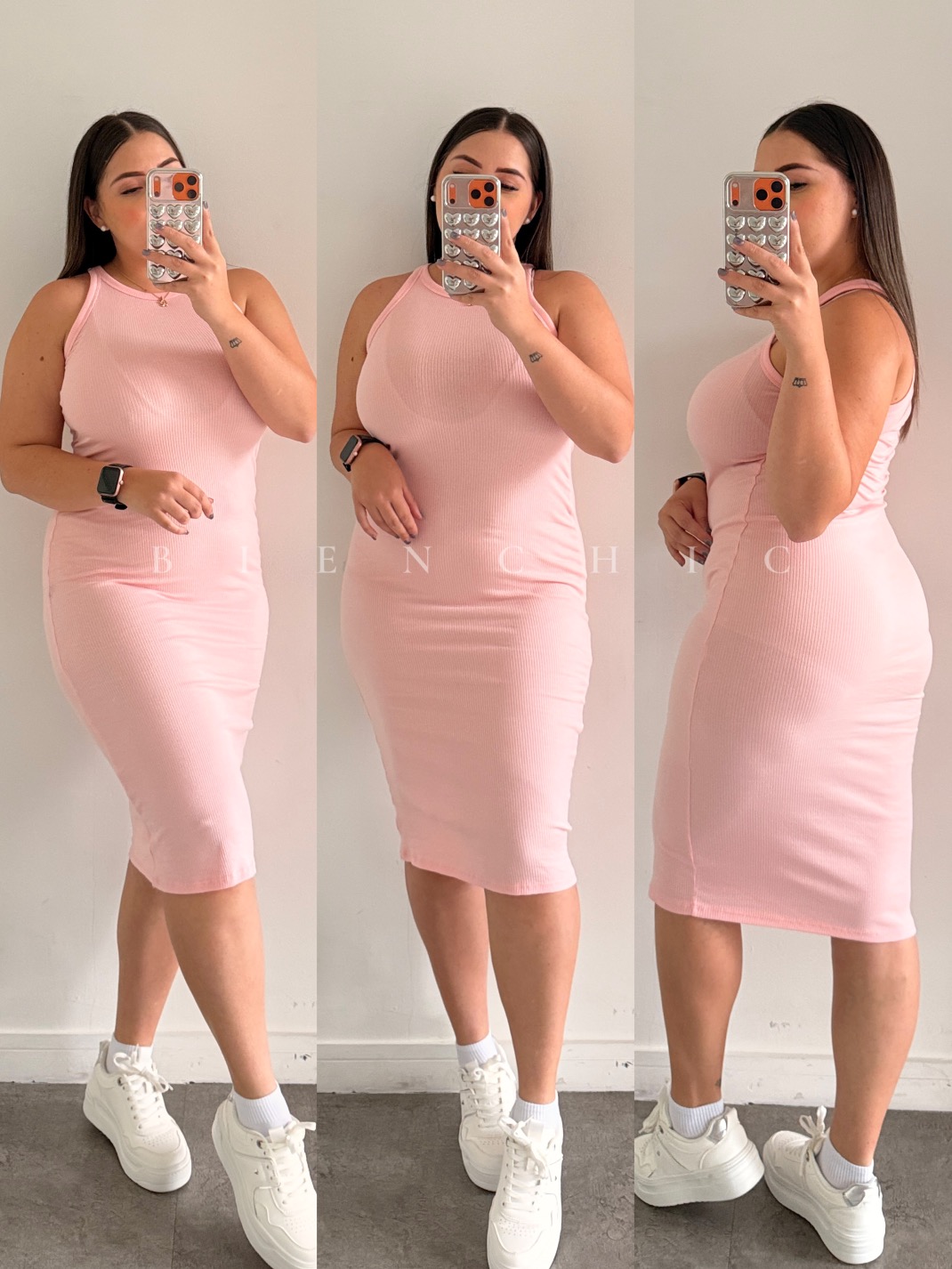 - Modelo Delgada uso talla M – Modelo Curvy talla L